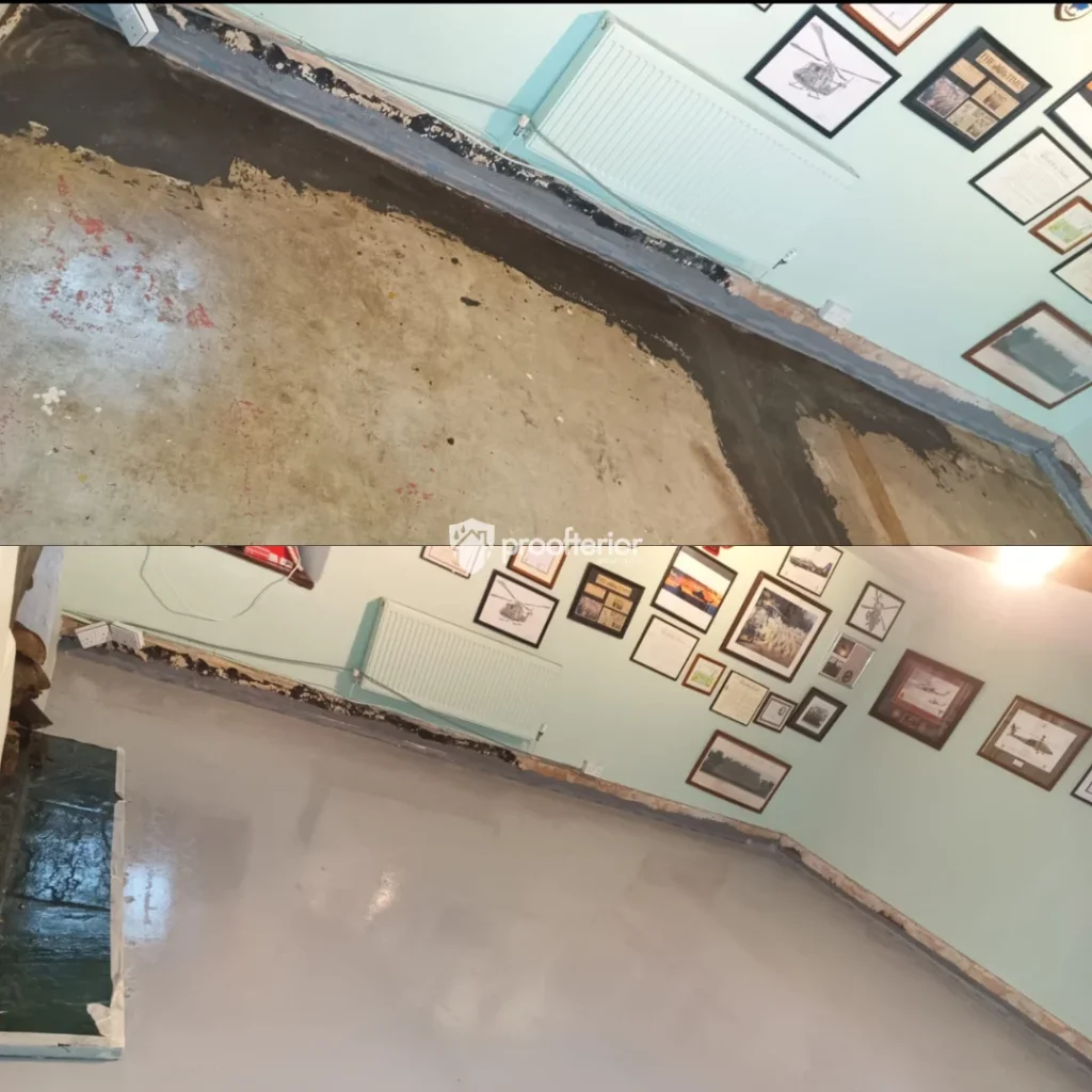 Where required, the coating was taken slightly up the wall perimeter to create a tanked skirting detail, reinforcing the wall/floor junction and preventing lateral moisture tracking.