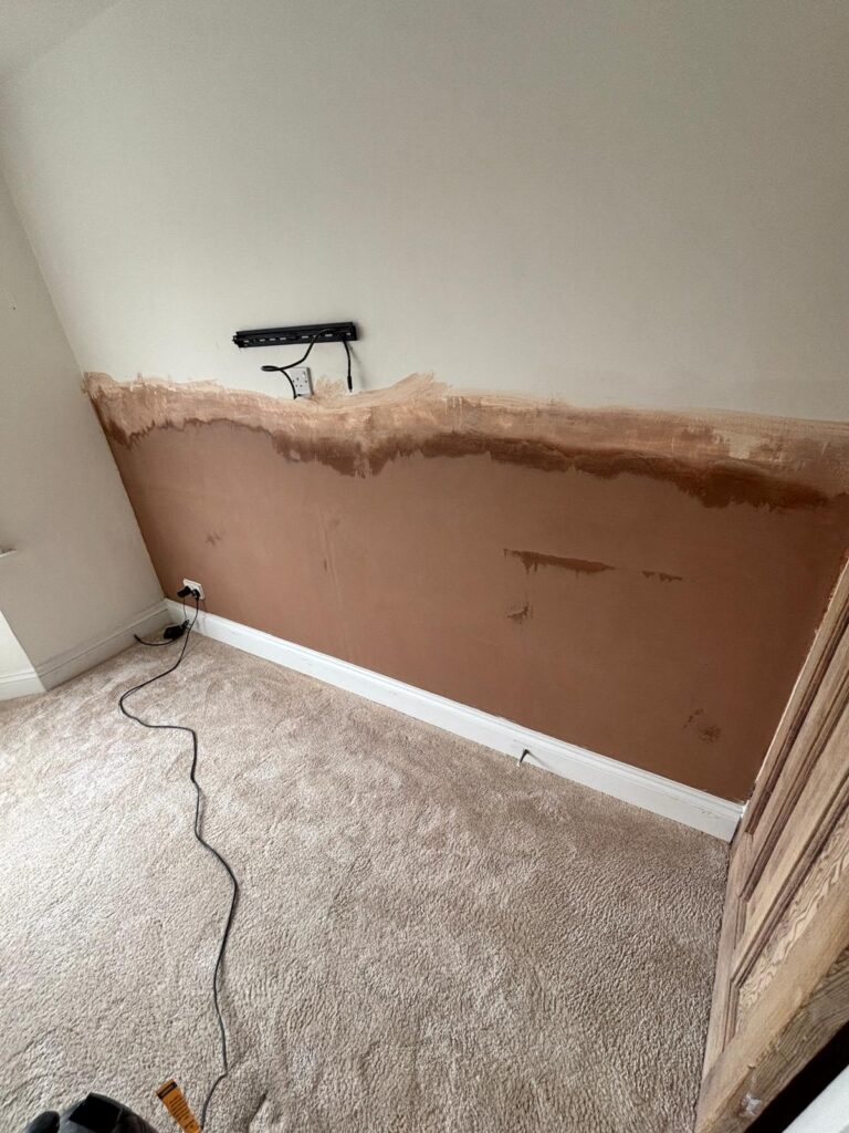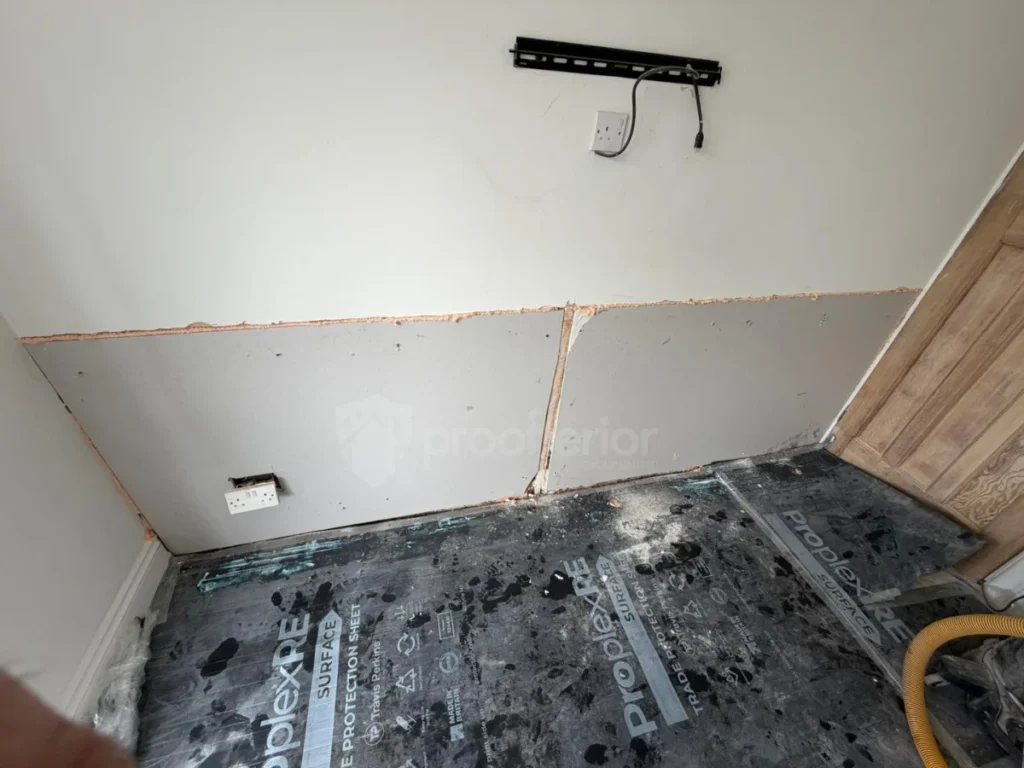 All work areas were carefully prepared, with floors and furnishings protected using professional coverings. Fixtures such as skirting boards, radiators, and electrical fittings were removed where necessary to allow full access to the affected wall surfaces .