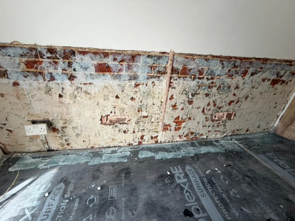 This step is critical in damp proofing Southampton properties because plaster often contains hygroscopic salts, which continue to attract moisture even after the wall begins to dry. Removing this contaminated material prevents future damp staining and decorative failure.